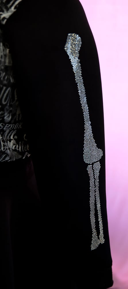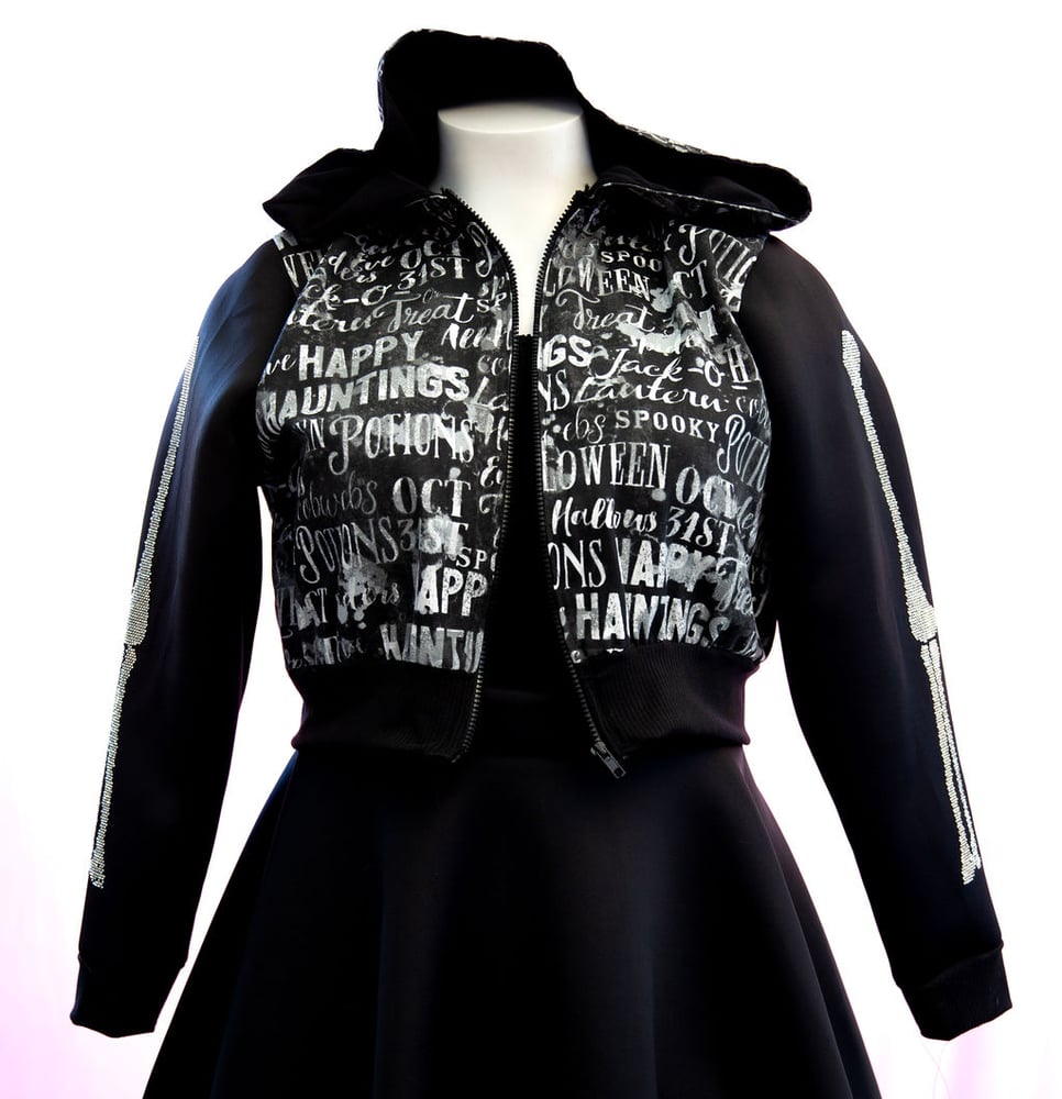 Feast your eyes on this one of a kind boo-tiful bomber jacket. It's so good, it's scary! With all these delightful little sayings, you'll be the talk of the graveyard... or at least the most fashionable ghoul at the party. And just look at those sparkly bones on the sleeves—they'll have you looking drop-dead gorgeous, darling! Perfect for a night out causing some delightful frights, or just lounging around your haunted mansion. Get yours now before they vanish into thin air!