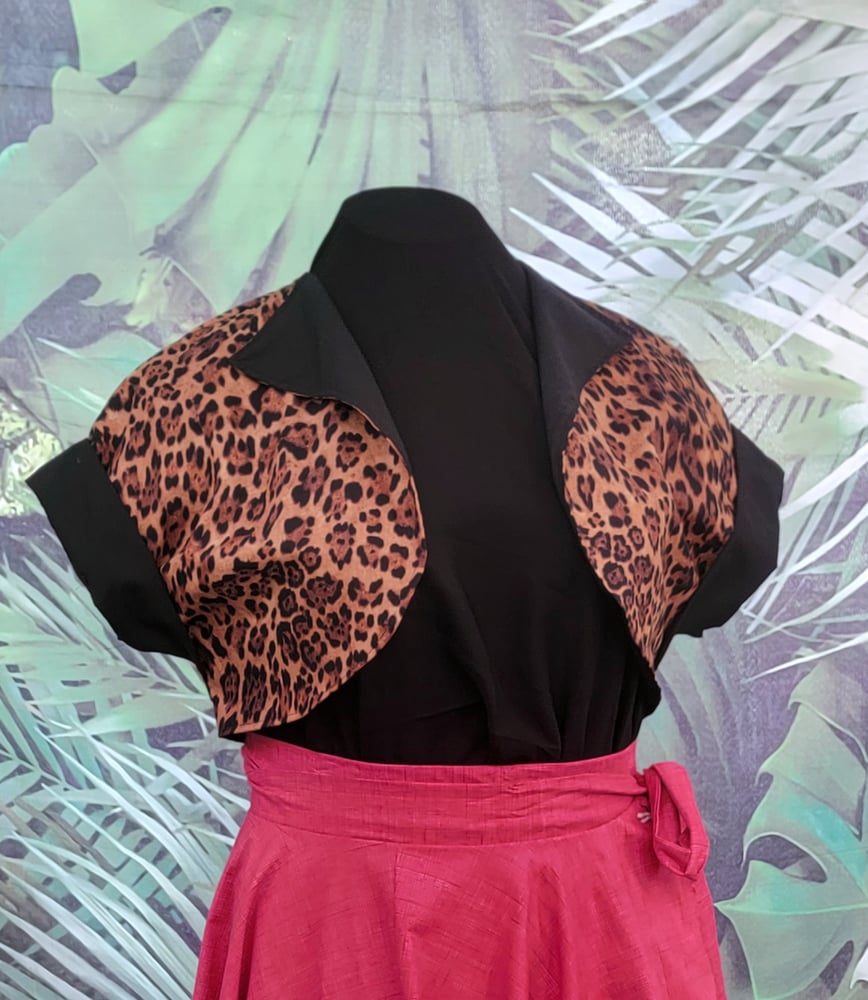 Rarr!! Get ready to strut like a stray cat in this fun leopard print bolero! This piece has a leopard body and black accents on the cuffs and lapels. You'll be the bee's knees and the cats... Bolero! In this, lovingly hand-made, over-piece for a night out on the town or a night in gabbing with the girls! Order a bolero today, and stalk your prey tomorrow! (or in the appropriate time frame for packing and shipping to your door) Did we mention that shipping is free*? (*Continental US only, sorry friends outside of the ConUS!)