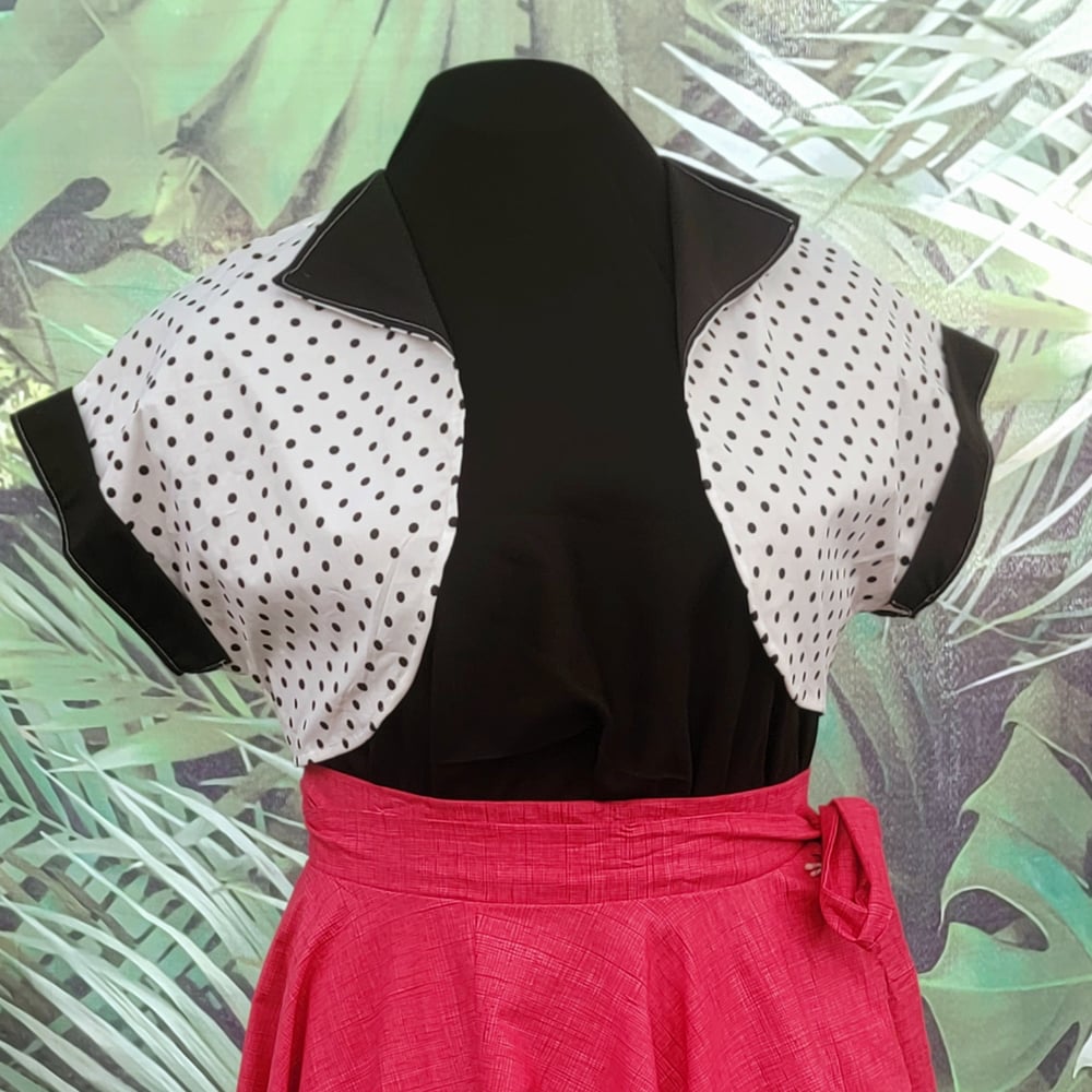 So cute! So Dotted! Look at this adorable White and Black Polka Dotted Bolero! This piece has a White with Black Dotted body and black accents on the cuffs and lapels. You'll be the talk of the town and the.. um.. Polkadot of the town too!! In this, lovingly hand-made, over-piece for a night out on the town or a night in gabbing with the girls! Order a bolero today, and amass adoring fans tomorrow! (or in the appropriate time frame for packing and shipping to your door) Did we mention that shipping is free*? (*Continental US only, sorry friends outside of the ConUS!)